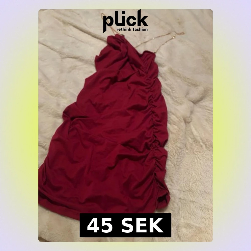 Trendig röd kort klänning med tunna axelband i kedja och snygga rynkade detaljer längs sidan. Klänningen har en omlottliknande överdel och är perfekt för dig som vill sticka ut. Materialet känns mjukt och följsamt.