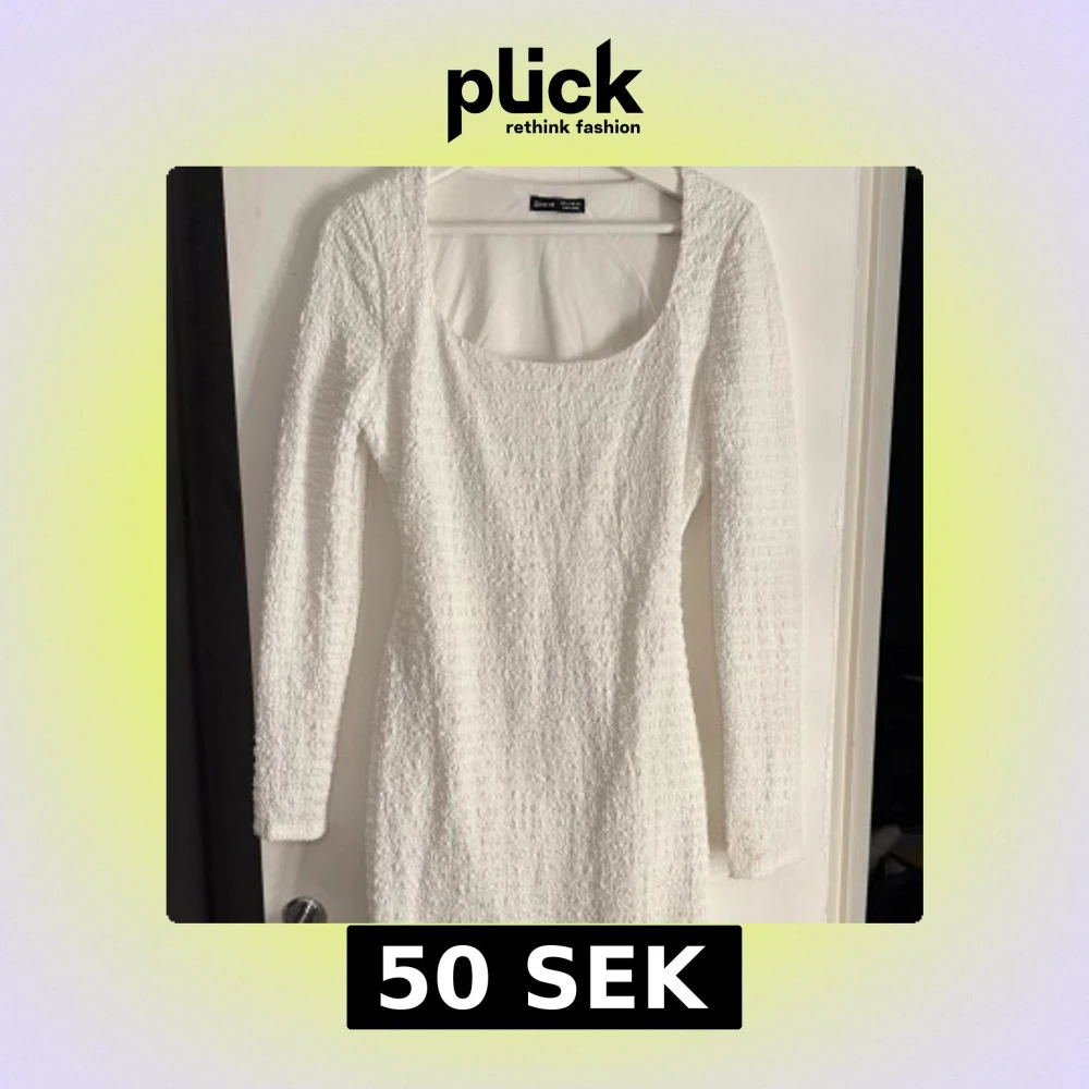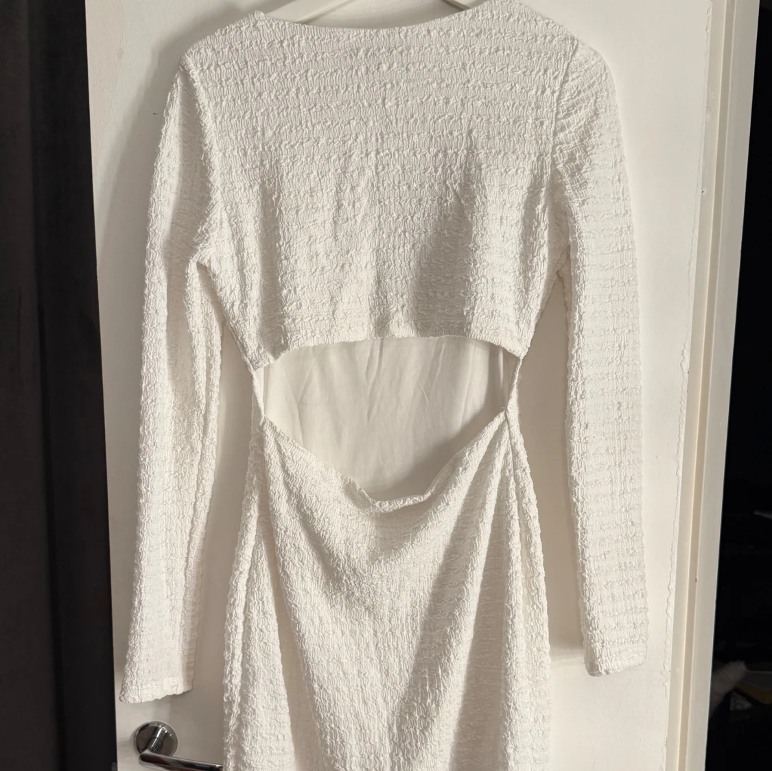 Vit klänning med öppen rygg - Snygg vit klänning med långärmad design och en djärv öppen rygg som knyts. Perfekt för en stilren look med en touch av elegans. Den korta längden ger en modern känsla. Den är använd en gång på skolavslutningen och kommer inte mer till användning