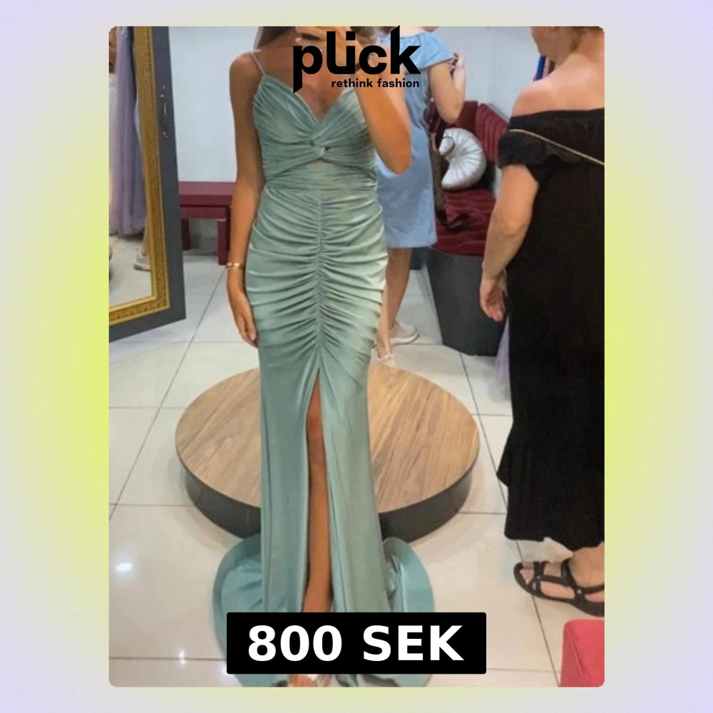 Helt ny med prislapp. Elegant mintgrön lång klänning från Sibel Aydin med smala axelband, draperad framsida och hög slits. Klänningen har figurnära passform och är tillverkad i ett glansigt, satinliknande material som ger en lyxig känsla. Kedja som är avtagbar