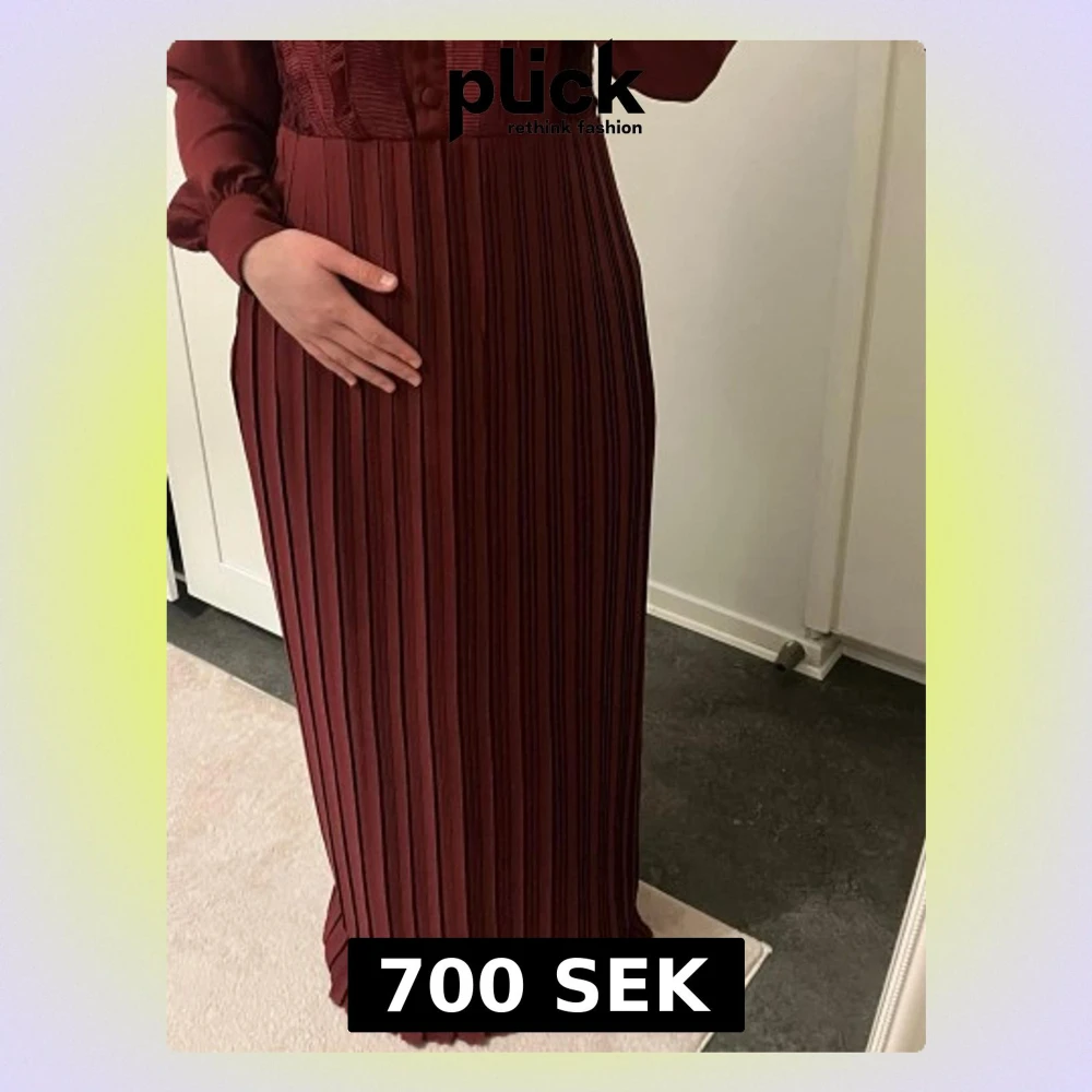 Vinröd långklänning med plisserad kjol, knappar framtill och volangdetaljer på överdelen. Klänningen har långärmade, transparenta ärmar och markerad midja. Elegant och stilren design, perfekt för dig som vill sticka ut.