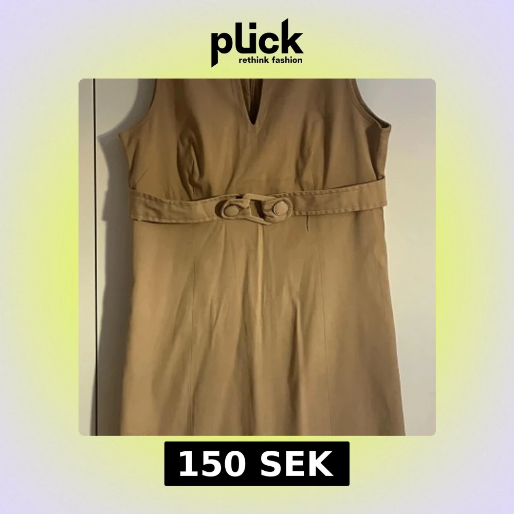 Stilren beige klänning med ärmlös design och markerad midja med bälte och knappar. Klänningen har en snygg v-ringning framtill och dragkedja i ryggen. Perfekt för dig som gillar minimalistisk och klassisk stil.