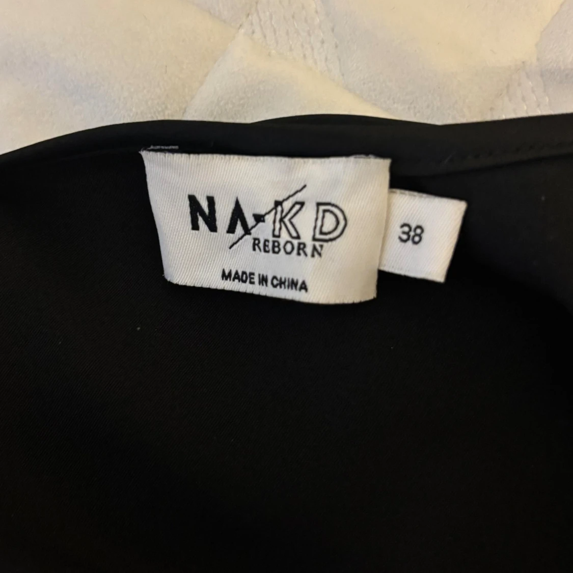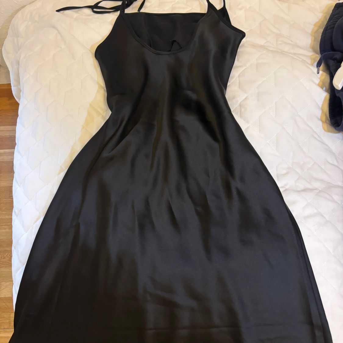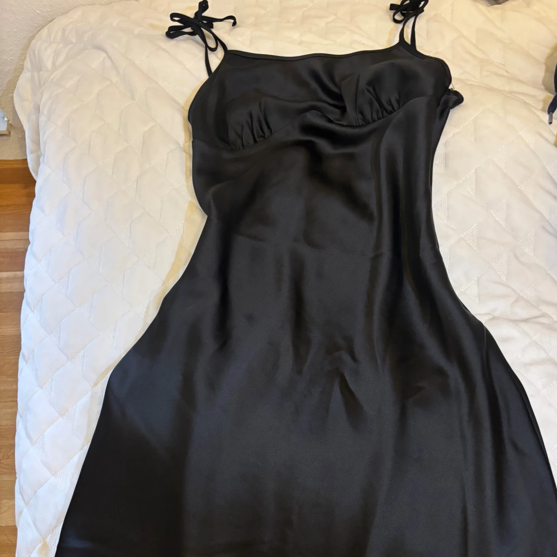 Säljer en svart silkes klänning med längden till knäna från NA-KD Reborn med smala axelband som knyts på axlarna. Klänningen har en slät, glansig yta och en figurnära passform med lätt rynk vid bysten. Perfekt för dig som gillar stilrena och eleganta plagg.