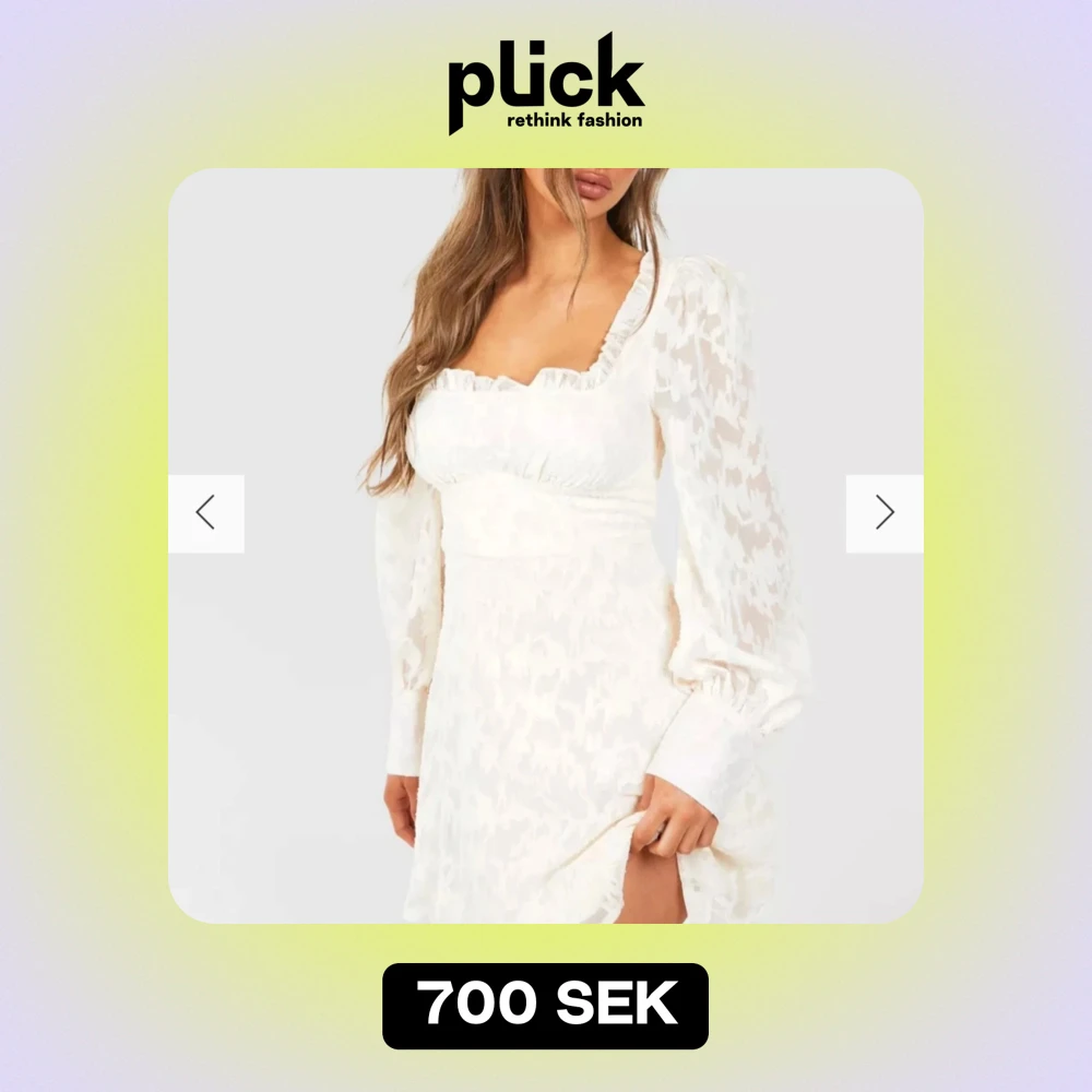 Superfin off white klänning med långa ärmar och ett subtilt mönster. Den har en söt volangdetalj vid halsringningen och en smickrande passform. Perfekt för vår och sommar, kanske till en fest, midsommarfirande eller till studenten. Klänningen har en elegant och romantisk stil.