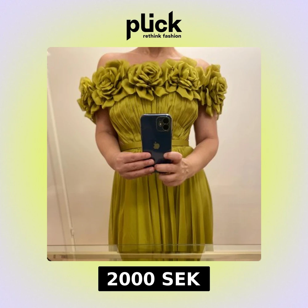 Säljer en maxilång grön klänning med offshoulder-modell och stora 3D-blommor längs överdelen. Klänningen har markerad midja med bälte och plisserad kjol som faller snyggt. Perfekt för bal eller fest.