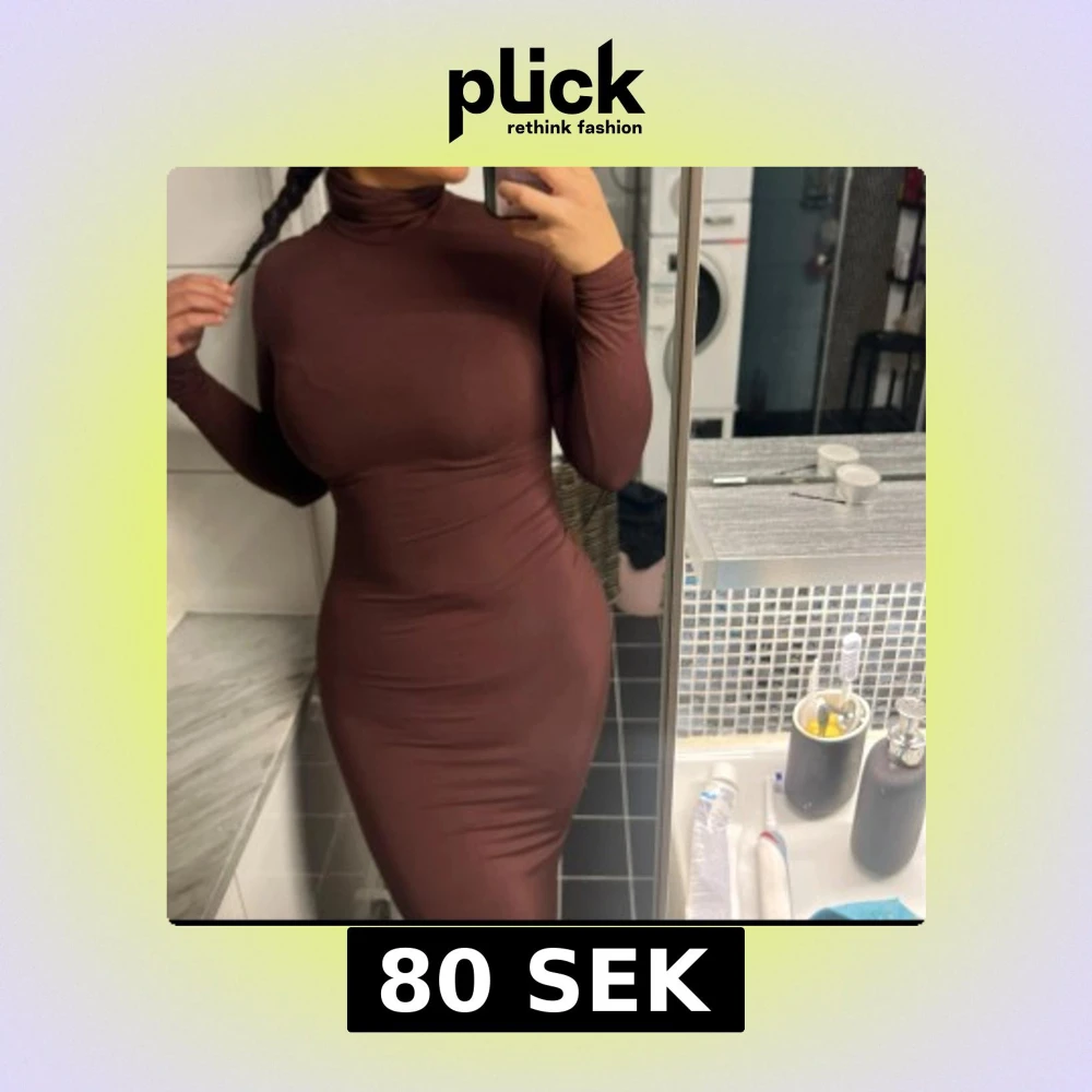 Säljer en snygg brun långklänning med polokrage och långa ärmar. Klänningen är figurnära och har en stilren, minimalistisk look utan mönster eller detaljer. Perfekt för dig som gillar en enkel men elegant stil.