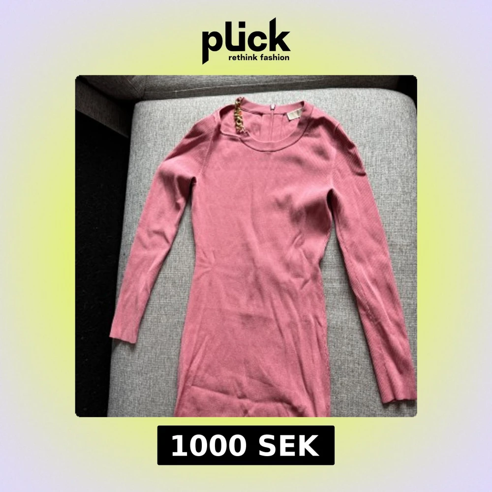 Säljer en rosa ribbad klänning från Michael Lors med lång ärm och rund halsringning och en kedja med MK loggan. Klänningen har en tight passform och är tillverkad i ett stretchigt material som sitter snyggt på kroppen. Perfekt för dig som gillar enkel men stilren design.