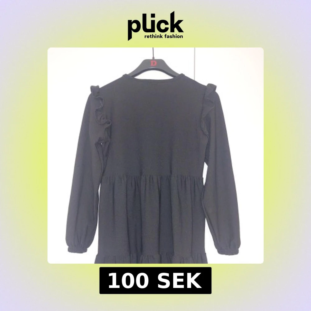 En svart klänning med lång ärm och volangdetaljer. Klänningen har en lös passform och är sydd i flera våder för en luftig känsla. Perfekt för dig som gillar en enkel men stilren look.