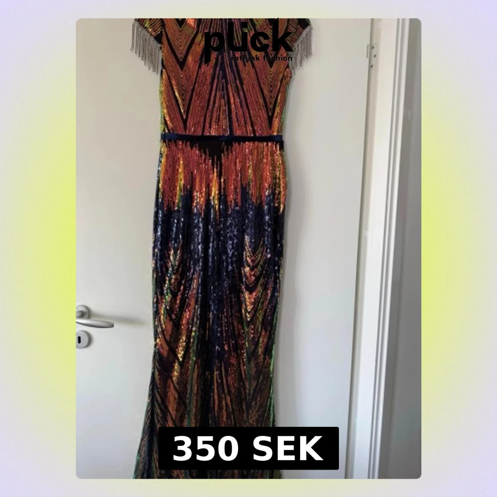 Säljer en maxad långklänning med glittriga paljetter i marinblått, orange, guld och grönt. Klänningen har korta ärmar med fransdetaljer och ett geometriskt mönster som verkligen sticker ut. Perfekt för dig som vill synas på bal eller fest!