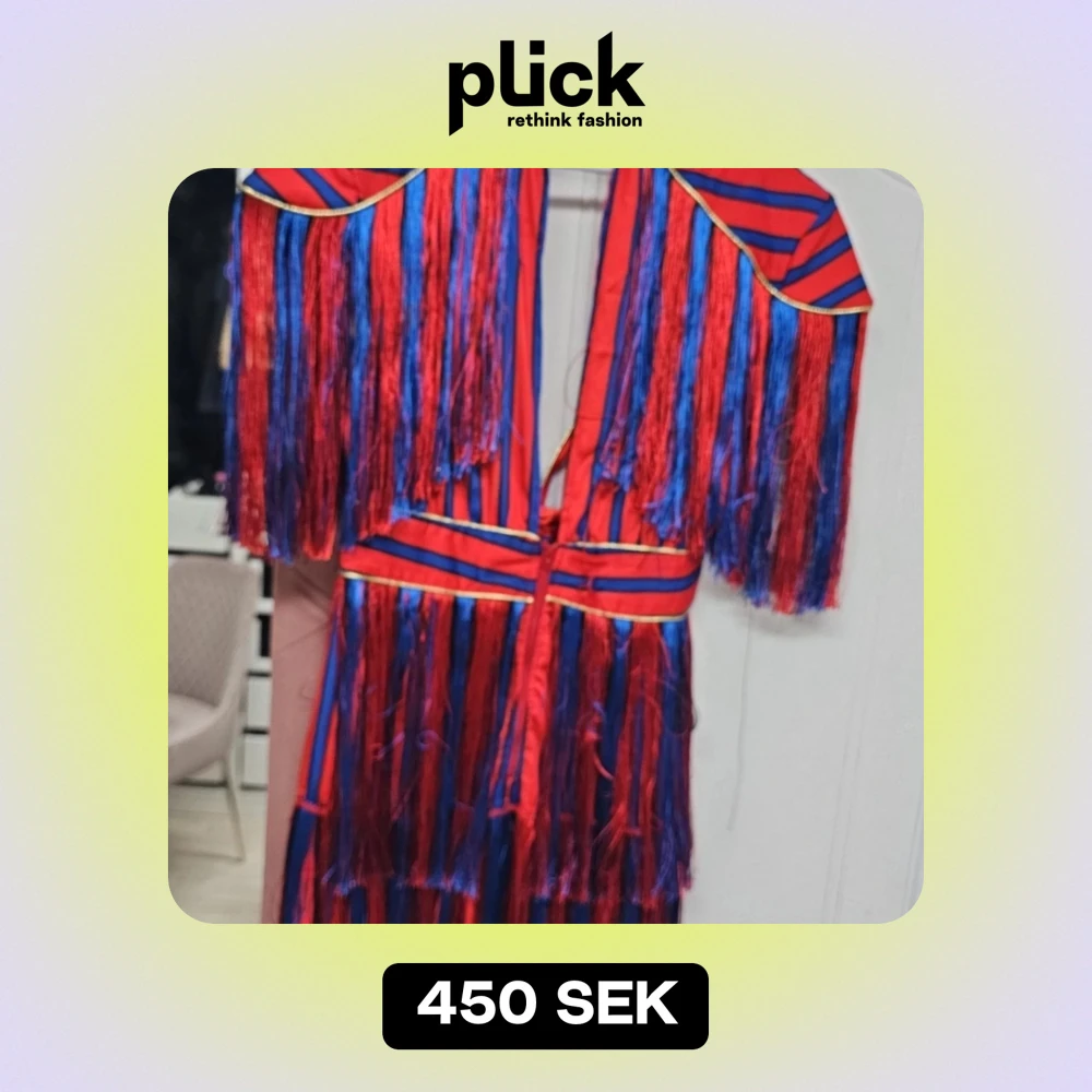 Unik klänning i rött och blått med randigt mönster och fransdetaljer. Klänningen har en djärv design med fransar som ger en extra touch. Perfekt för den som vill sticka ut.