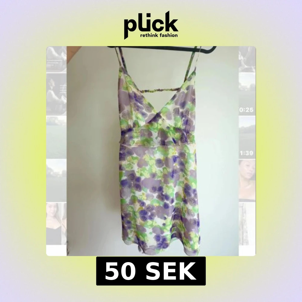 Superfin kort klänning med blommigt mönster i lila, grönt och vitt. Klänningen har smala axelband, v-ringning och en snygg öppen rygg med banddetalj. Perfekt för sommarens varma dagar och har en luftig känsla tack vare det tunna materialet.