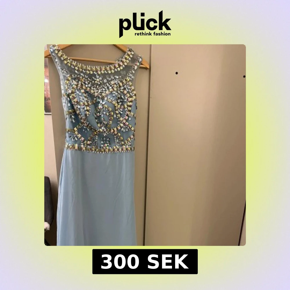 Elegant ljusblå långklänning med glittrande paljettdetaljer på överdelen och axlarna. Klänningen har en transparent övre del med ett vackert mönster av paljetter och en slät kjol. Perfekt för festliga tillfällen.