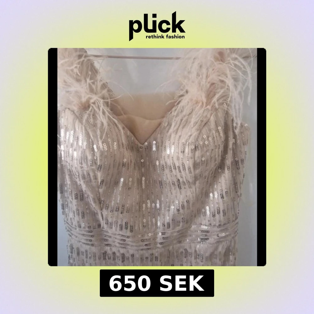 Säljer en elegant långklänning i champagnefärg med smala axelband dekorerade med fjädrar. Klänningen är täckt av glittriga paljetter och har en v-ringad urringning. Perfekt för bal eller festliga tillfällen.