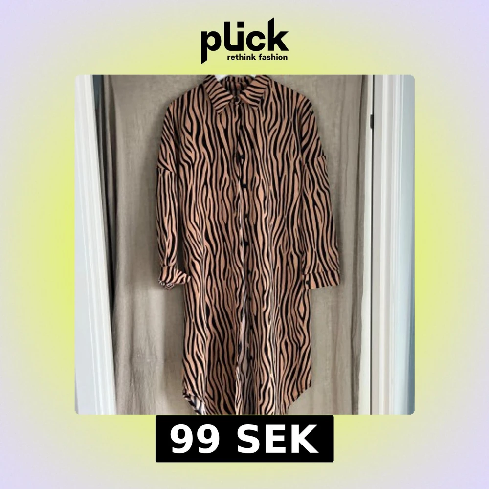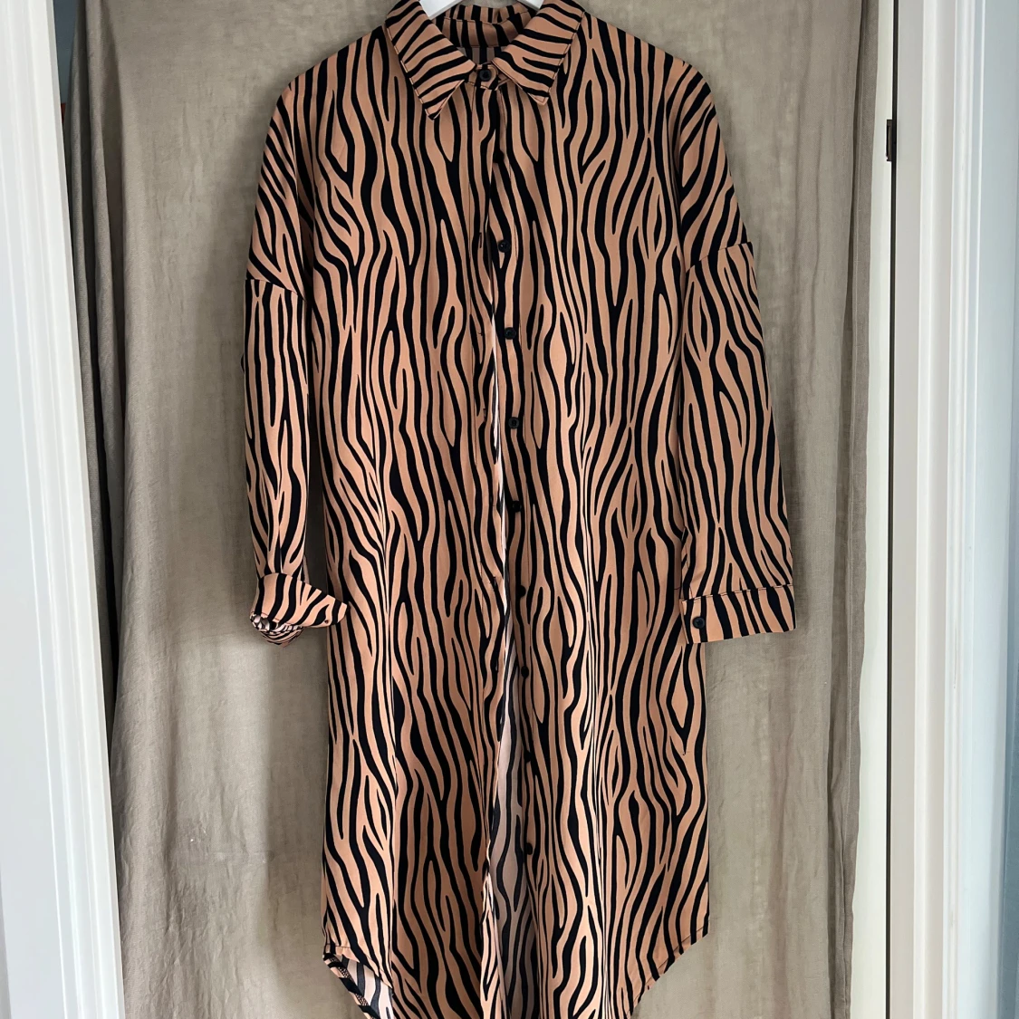 Snygg långklänning med zebramönster i beige och svart. Klänningen har långa ärmar, knappar framtill och en avslappnad passform. Perfekt för dig som vill sticka ut med ett djurmönster och cool stil.