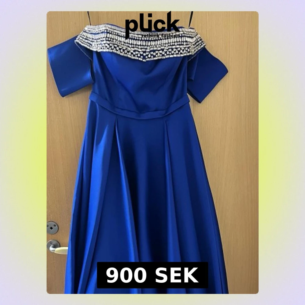 Elegant blå långklänning med offshoulder-design och bred pärlbesatt kant upptill. Klänningen har en utsvängd kjol och är tillverkad i ett glansigt material som ger en lyxig känsla. Perfekt för bal eller festliga tillfällen.