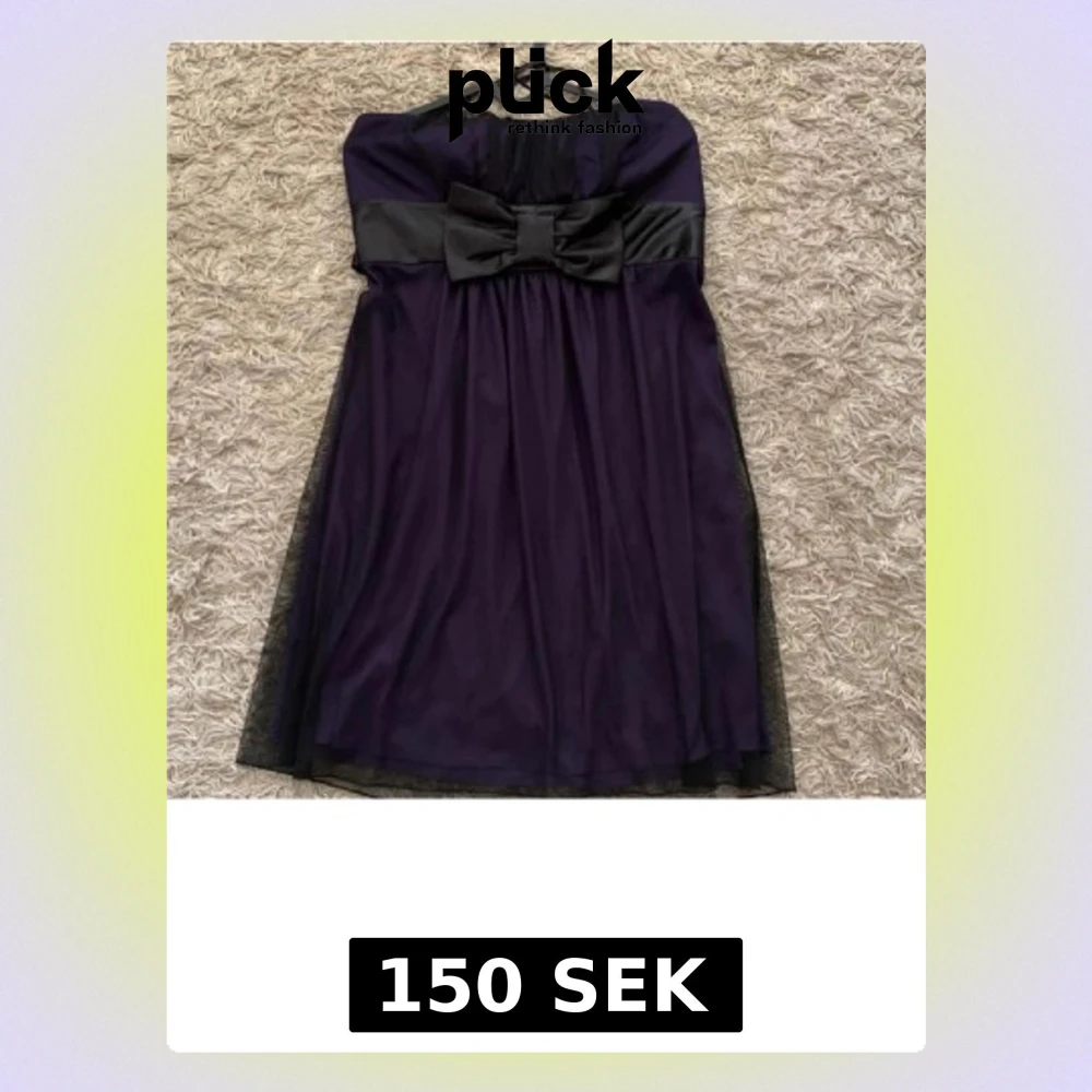 Snygg mörklila axelbandslös klänning med svart satinband i midjan och stor rosett framtill. Klänningen har ett lätt utställt fall och är knälång med ett tunt lager tyll över kjolen. Perfekt för dig som vill sticka ut med en elegant look.