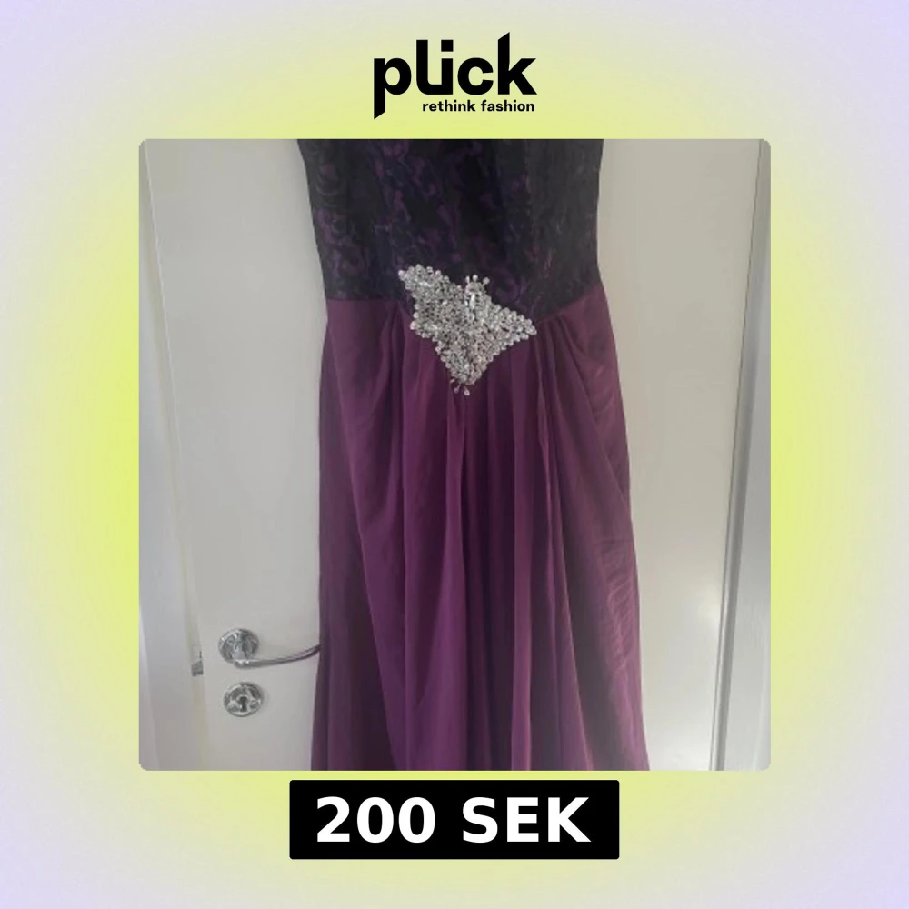 Elegant långklänning i mörklila med svart spets upptill och en vacker pärldetalj i midjan. Perfekt för festliga tillfällen med sin glamorösa design. Det finns i Norrköping endast i Norrköping