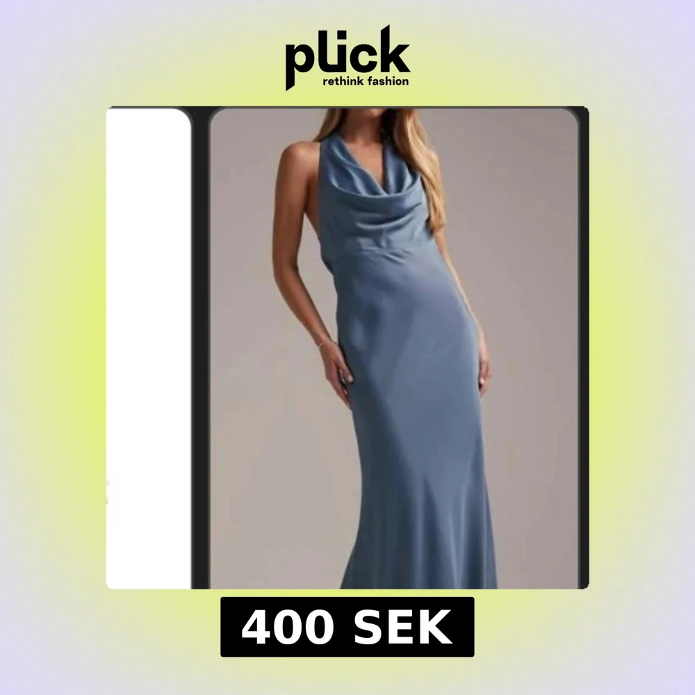 Säljer en elegant blå långklänning med draperad halsringning och ärmlös design. Klänningen har en smickrande, figurnära passform och är tillverkad i ett mjukt, glansigt material som ger en lyxig känsla.