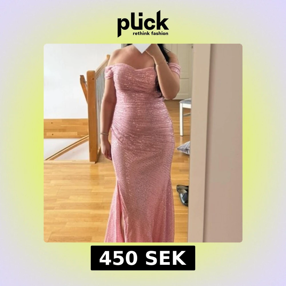 Supersnygg rosa långklänning med glittriga paljetter och offshoulder-modell. Klänningen har en figurnära passform, slits framtill och vackra draperingar över bysten. Perfekt för bal eller festliga tillfällen.