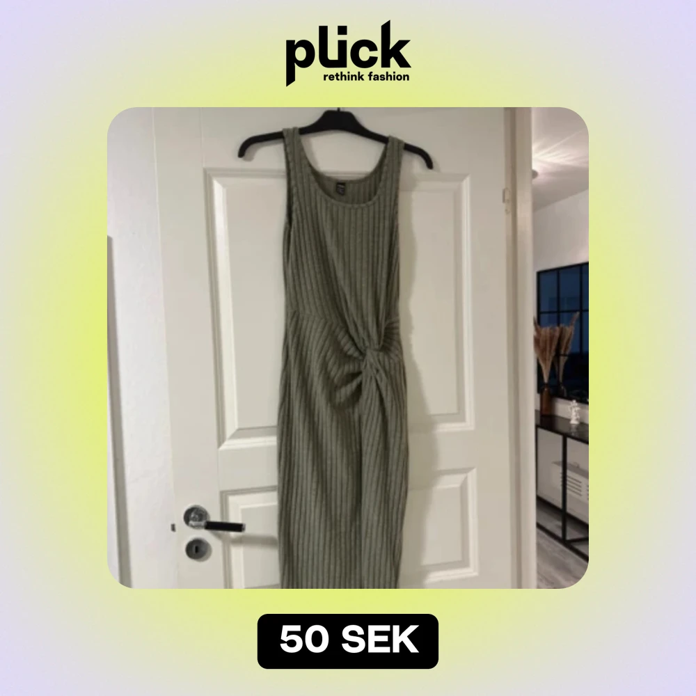 En grön ribbad klänning med knytning framtill. Klänningen är ärmlös och har en normal passform.