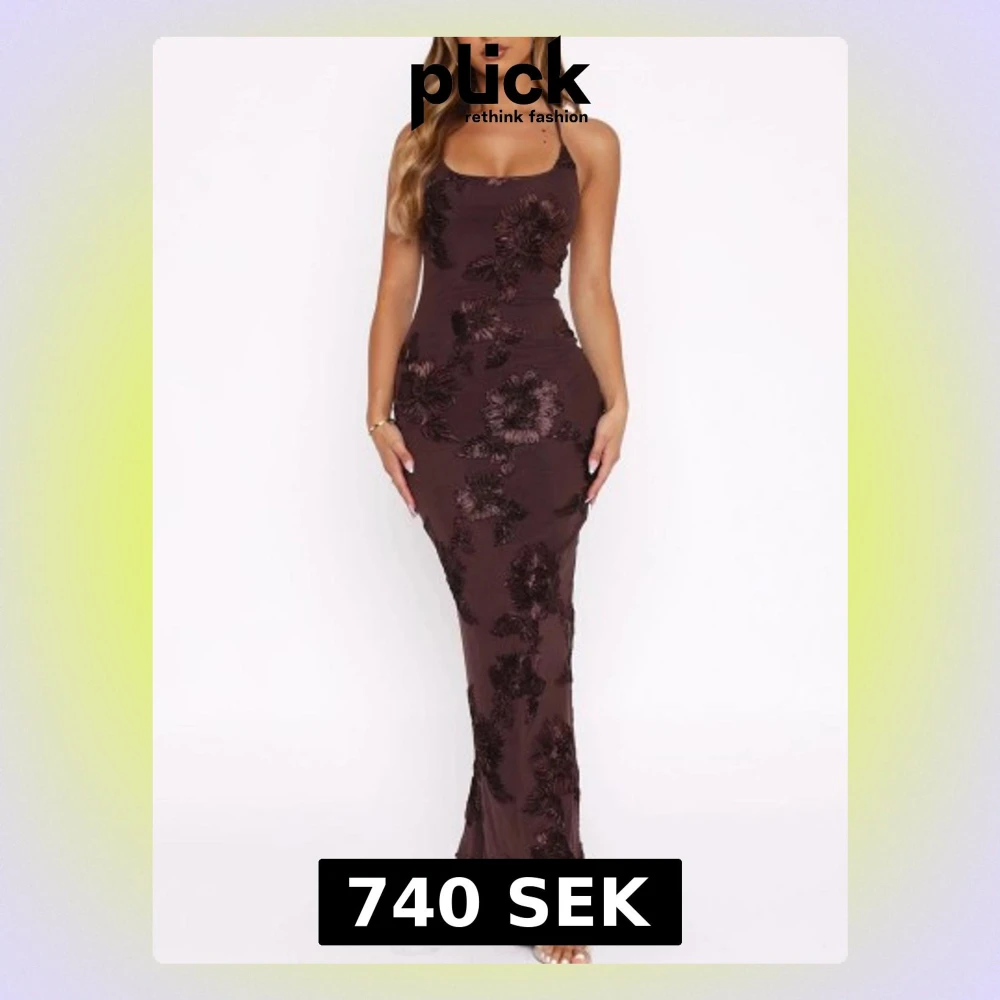 Säljer en elegant brun långklänning med tunna axelband och öppen rygg. Klänningen har ett vackert blommigt mönster i samma ton och är tillverkad i ett glansigt material som ger en lyxig känsla. Klänning är använd enbart en gång, det finns inga skador och den är insydd till storlek M.