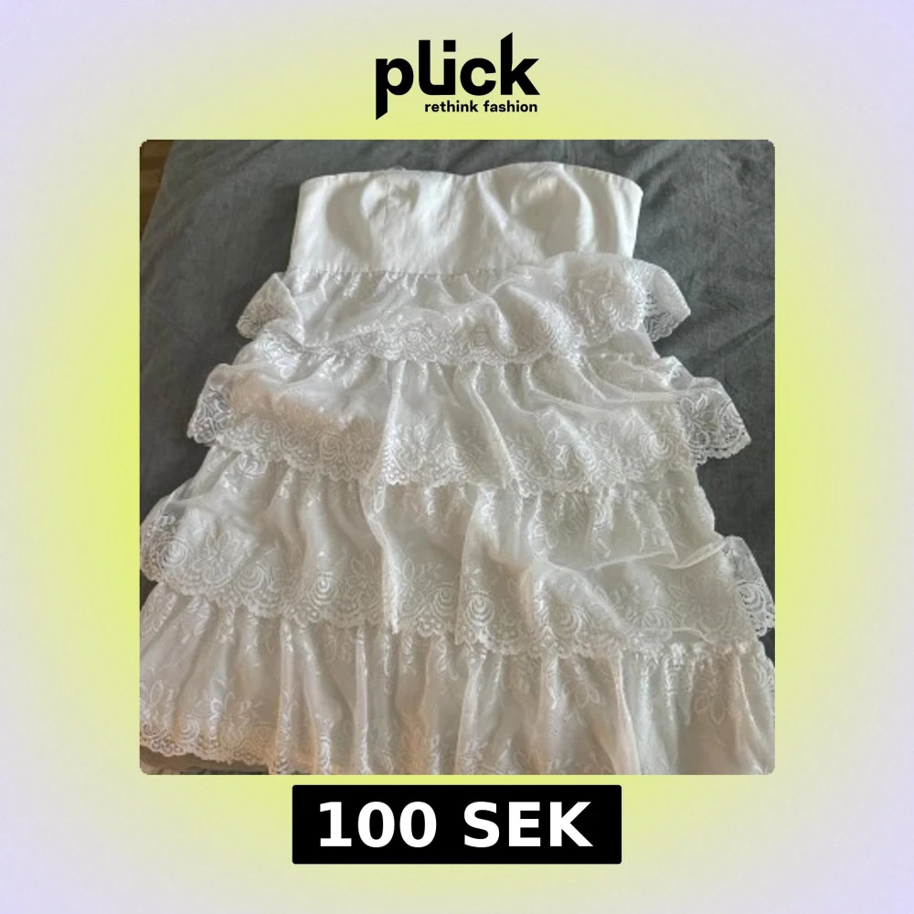 Supersöt vit axelbandslös kortklänning med flera lager volanger i spets och blommigt mönster. Perfekt för sommarens alla tillfällen när du vill känna dig extra fin och romantisk.