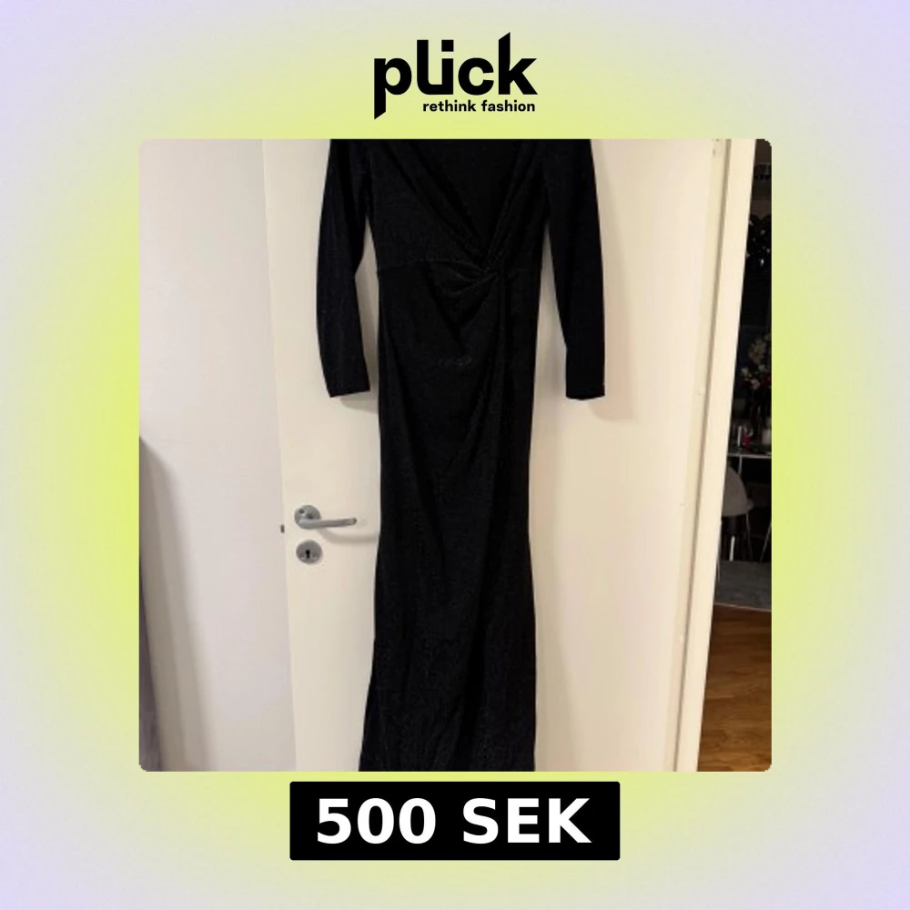 Elegant svart långklänning med glittrande detaljer och en v-ringad omlottdesign. Klänningen har långa ärmar och en stilfull drapering framtill som ger en smickrande passform. Perfekt för festliga tillfällen.