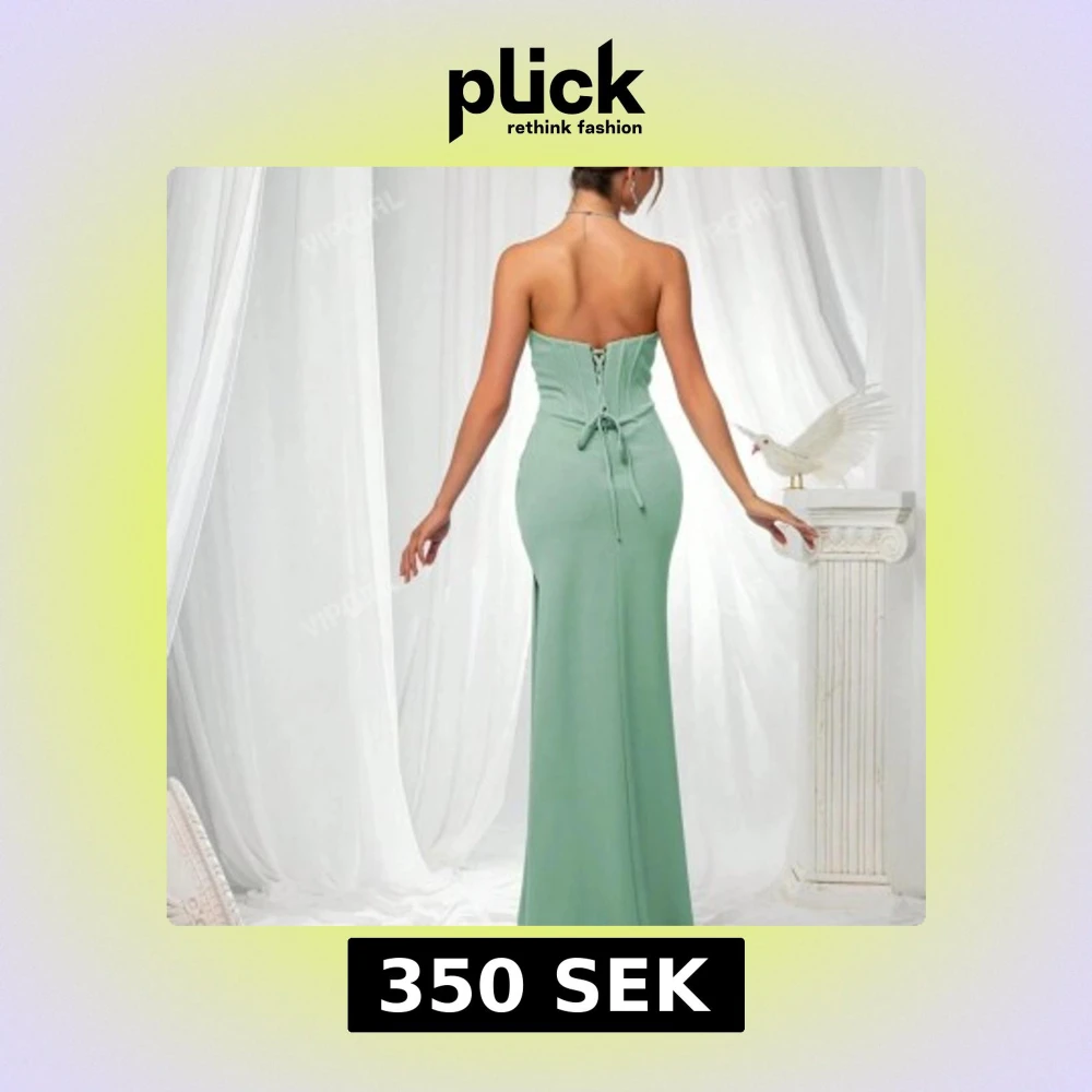Elegant mintgrön axelbandslös klänning med snörning i ryggen. Perfekt för en stilfull kväll med sin långa design och smickrande passform. Klänningen har en vacker v-ringning och är tillverkad i ett mjukt material som ger en lyxig känsla.