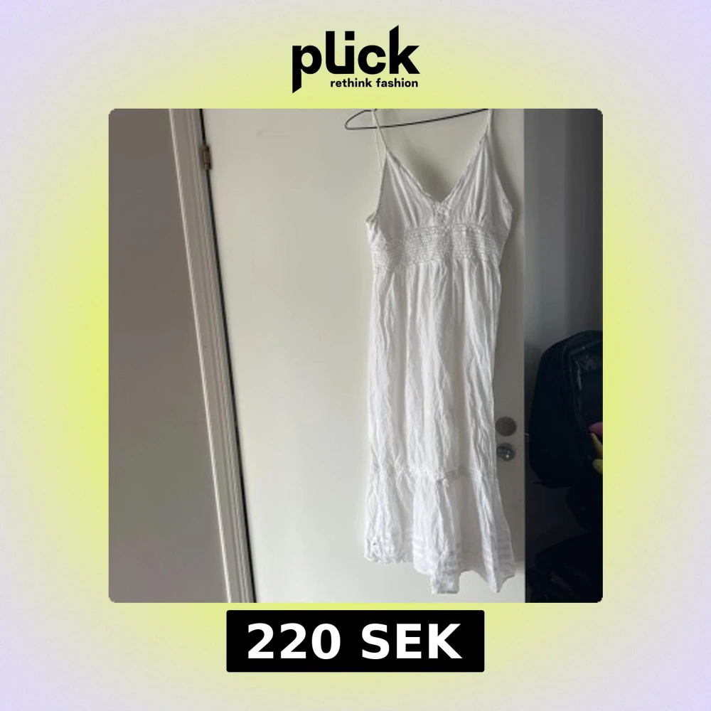 Säljer en vit långklänning med smala axelband och v-ringning. Klänningen har smockdetaljer över bysten och ett lätt, luftigt tyg som passar perfekt till varma dagar. Kjoldelen har en mjuk volangkant nertill för extra flow.