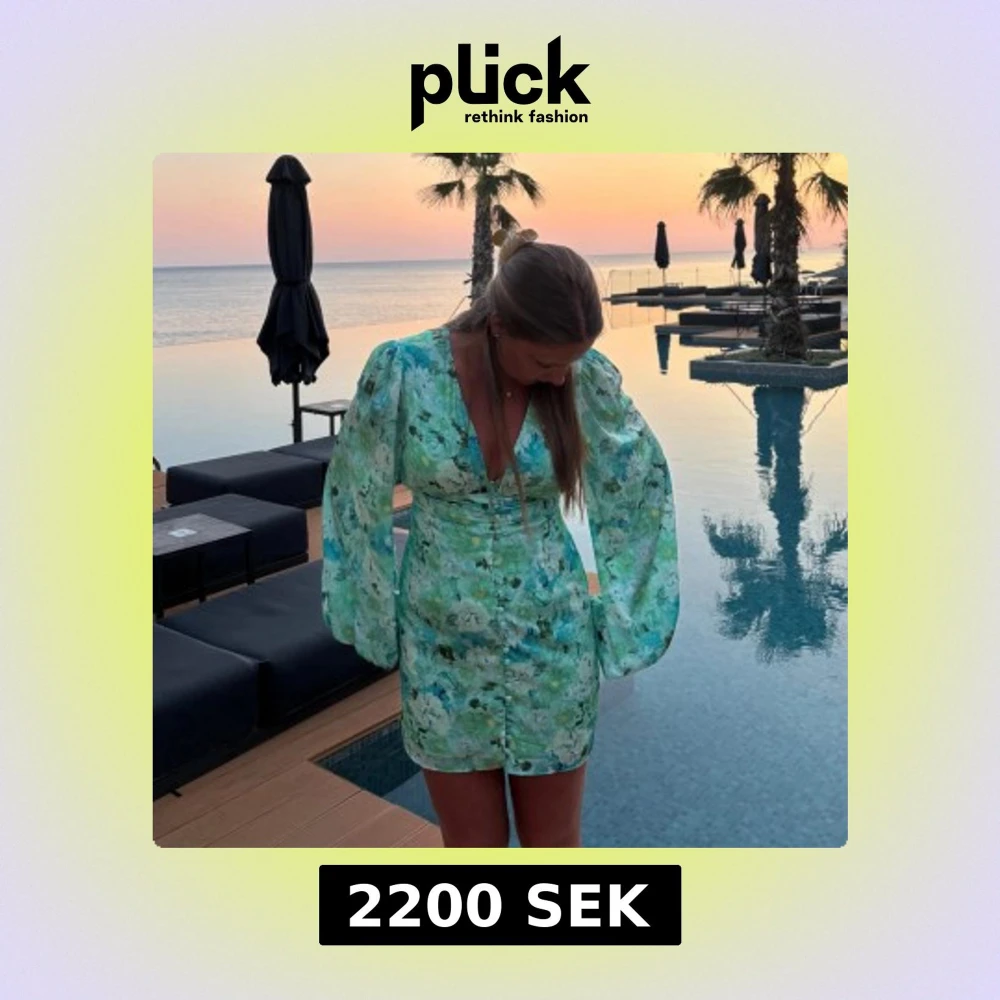 Superfin kort klänning i grönt med blommigt mönster och v-ringning. Klänningen har långa puffärmar och knappar framtill, perfekt för sommarkvällar. Sitter snyggt i midjan och har en fräsch vibe.
