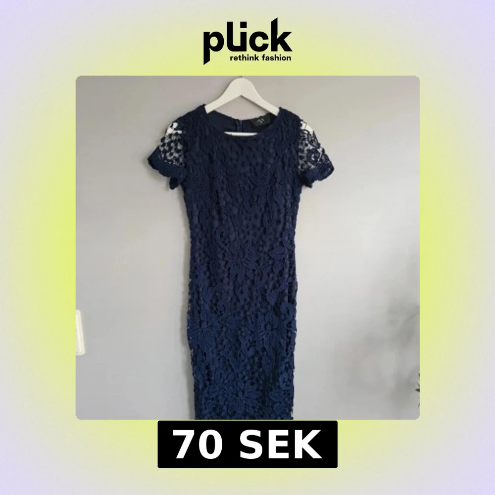 Säljer en marinblå spetsklänning från AX Paris med korta ärmar och rund hals. Klänningen har ett vackert blommigt spetsmönster och är fodrad med mjukt tyg. Passformen är normal och längden går till knäna. Perfekt för dig som gillar eleganta detaljer och stilren look.