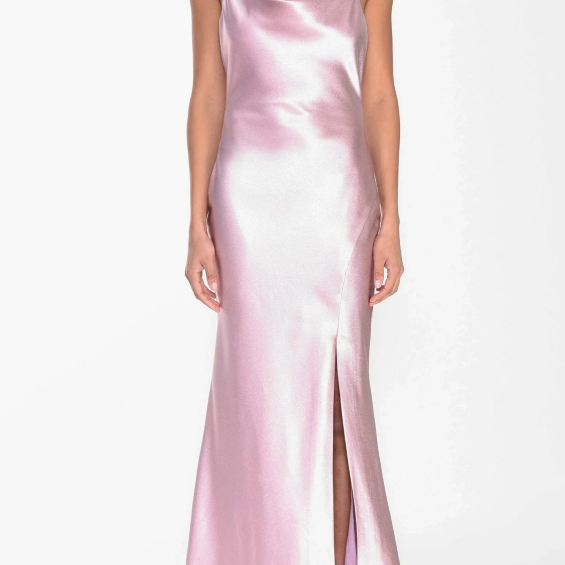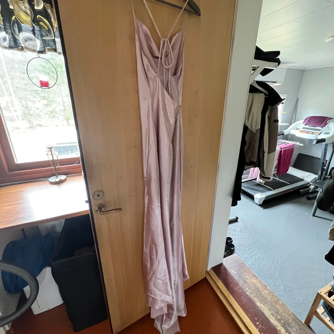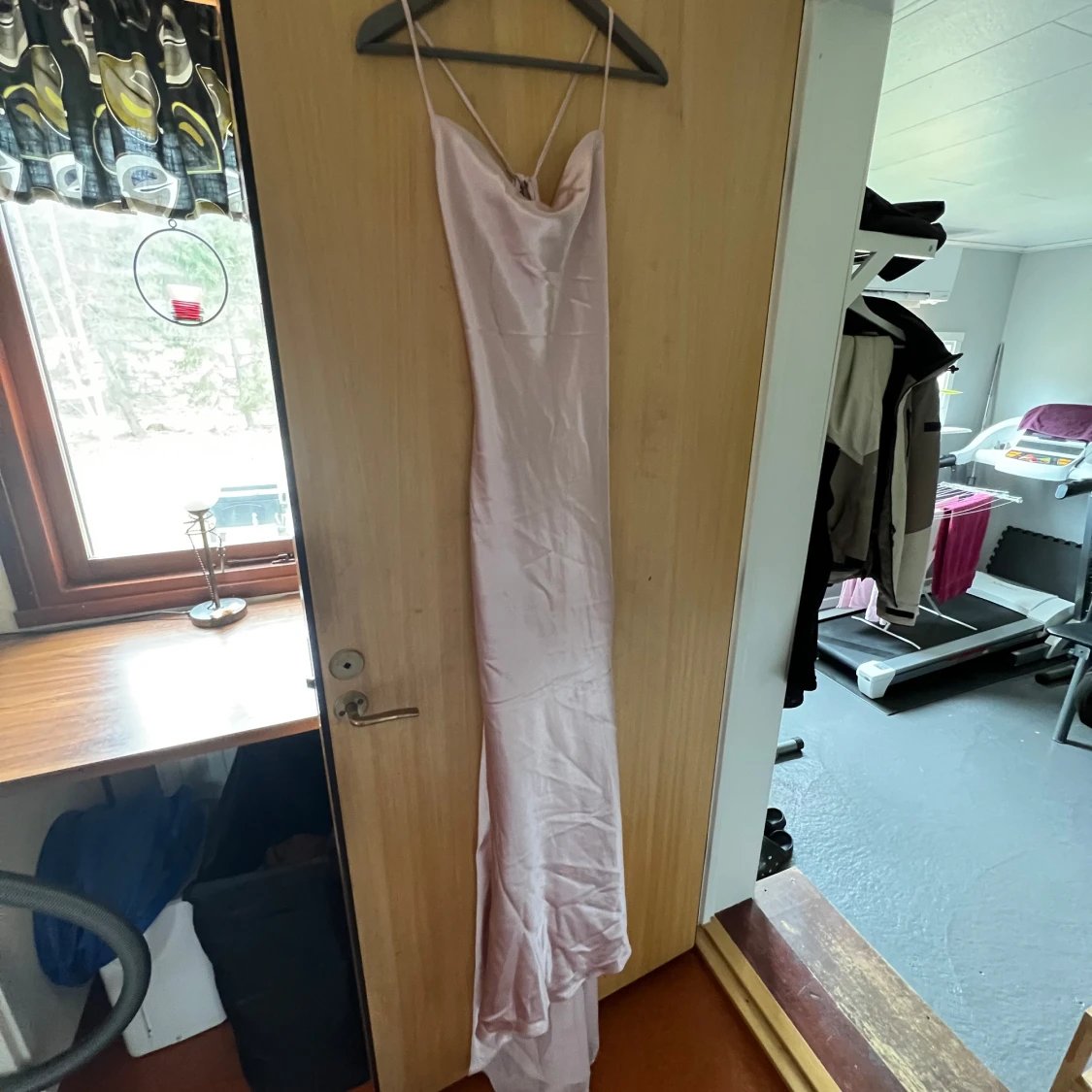Säljer en elegant ljusrosa långklänning i satin med smala axelband och öppen rygg med knyt. Klänningen har en slits framtill och ett glansigt material som ger en lyxig känsla. Perfekt för bal eller festliga tillfällen. Endast använd en gång, då den är i nyskick💕