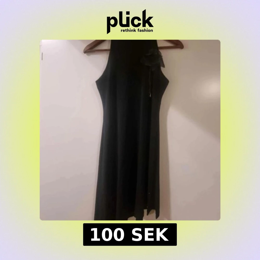 Elegant svart kortlänning med hög hals, dekorerad med små pärlor och en stor tygblomma på axeln. Klänningen är ärmlös och har en slits med pärldetaljer längs kanten. Perfekt för festliga tillfällen. Kan användas som överdel och ha på byxa eller kjol nedan.