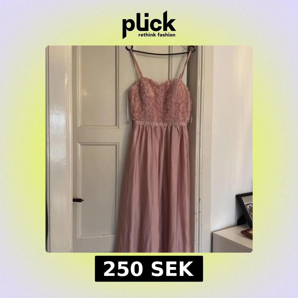 Superfin ljusrosa långklänning med smala axelband och ett överdel täckt av 3D-blommor i tyg. Kjolen är mjukt fallande och har en elegant siluett. Perfekt för bal eller student! Materialet känns som satin och tyll, vilket ger en lyxig känsla.