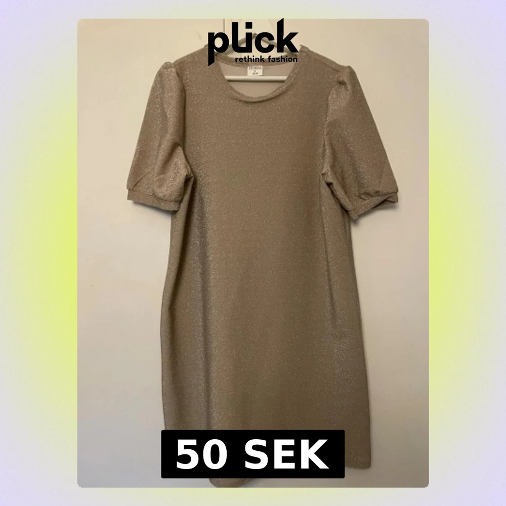 Kortklänning i glittrigt beige tyg. Klänningen har puffiga korta ärmar och rund halsringning. Perfekt för dig som vill sticka ut med en enkel men festlig look.
