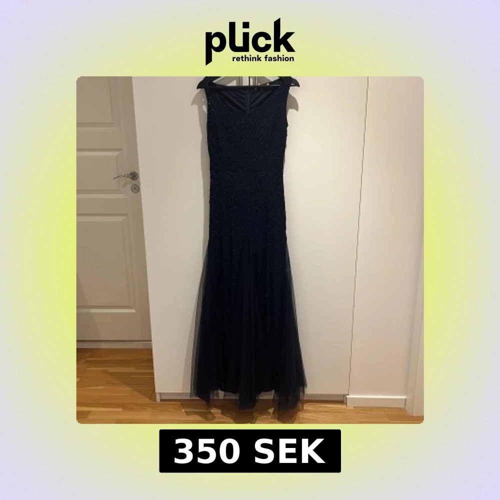 Elegant marinblå långklänning med v-ringad hals och ärmlös design. Klänningen har vackra spetsdetaljer upptill och ett flowy tylltyg nedtill som ger en lyxig känsla. Perfekt för bal eller festliga tillfällen när du vill sticka ut.