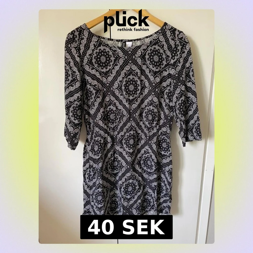 Svartvit klänning med snyggt paisleyinspirerat mönster. Modellen har trekvartsärm och rund halsringning. Perfekt för dig som gillar grafiska prints och vill ha en bekväm, stilren look.