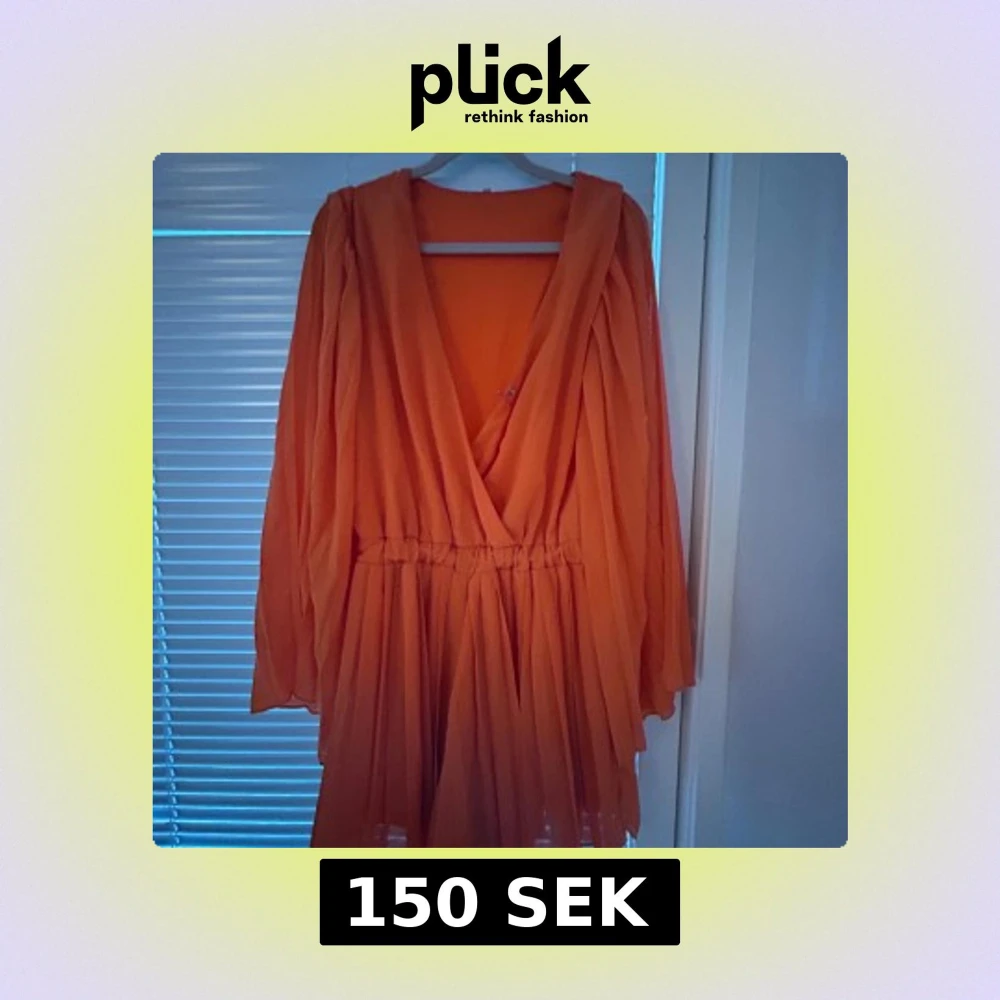 Säljer en kort orange omlottjumpsuit med v-ringning och långa, vida ärmar. Klänningen har resår i midjan och ett plisserat, luftigt tyg som ger en flowy känsla. Perfekt för dig som vill sticka ut med färg!