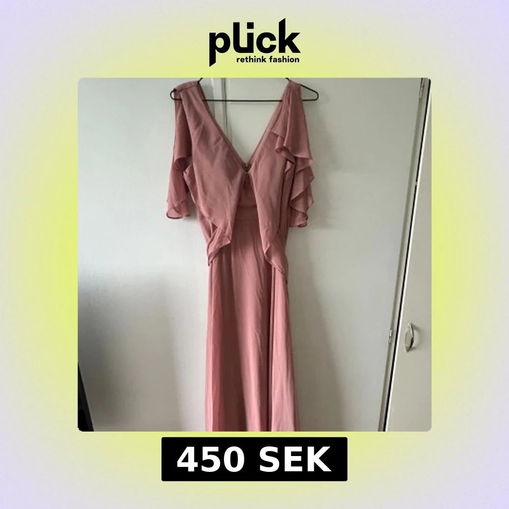 Säljer en ljusrosa långklänning med v-ringad front och volangdetaljer vid axlarna. Klänningen har korta ärmar, omlottkänsla och ett knytband i midjan samt dragkedja i bak.
