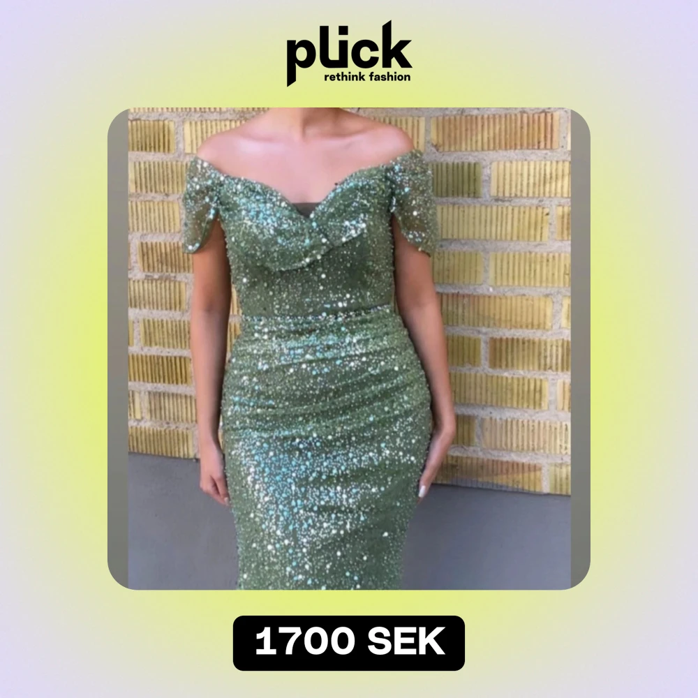 Säljer en fantastisk grön glittrig klänning med offshoulder-design. Klänningen är figurnära och har en elegant slits framtill. Perfekt för festliga tillfällen där du vill glänsa! ✨