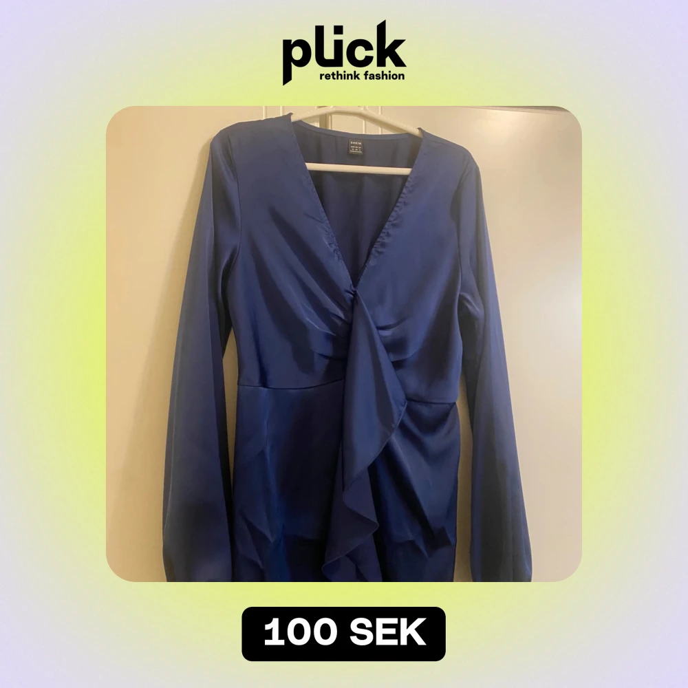 Säljer en elegant mörkblå långklänning från Shein. Klänningen har långa ärmar och en v-ringad omlott-design med volangdetaljer framtill. Perfekt för höst- och vinterfester! 💙