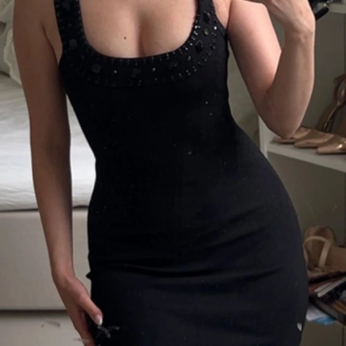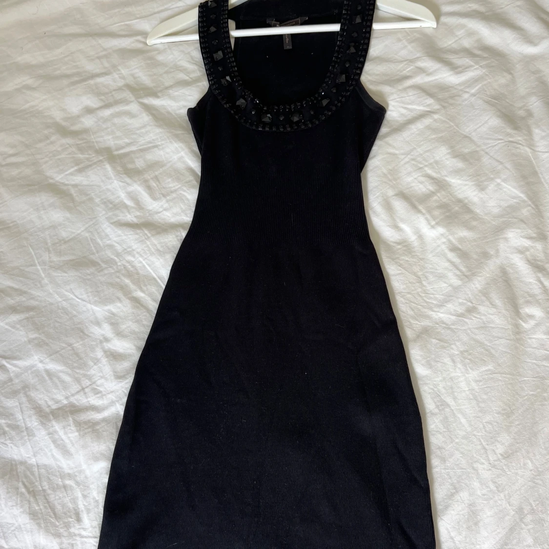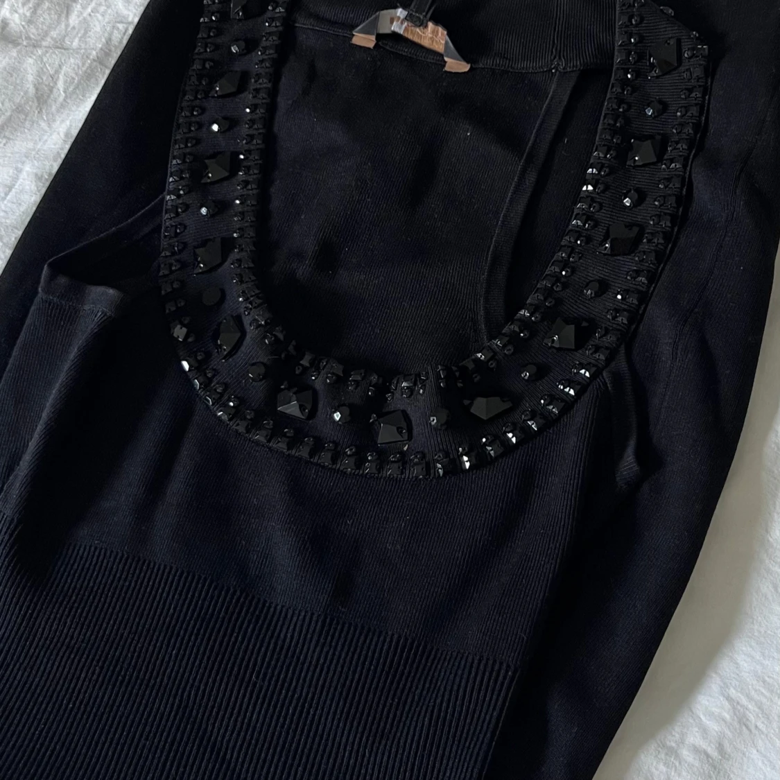Supersnygg svart tight klänning från BCBG Max Azria med markerad fyrkantig ringning och svarta pärldetaljer runt halsen. Ribbad struktur i tyget och ärmlös modell som sitter figurnära. Perfekt för dig som vill sticka ut med stil. Jag har storlek XS och den passar mig.
