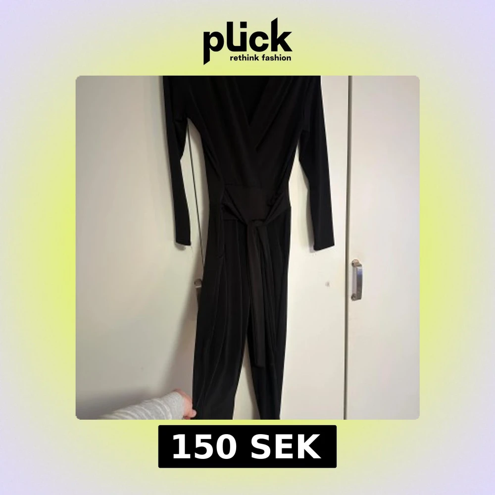 Elegant svart långärmad jumpsuit med omlott-design och knytband i midjan