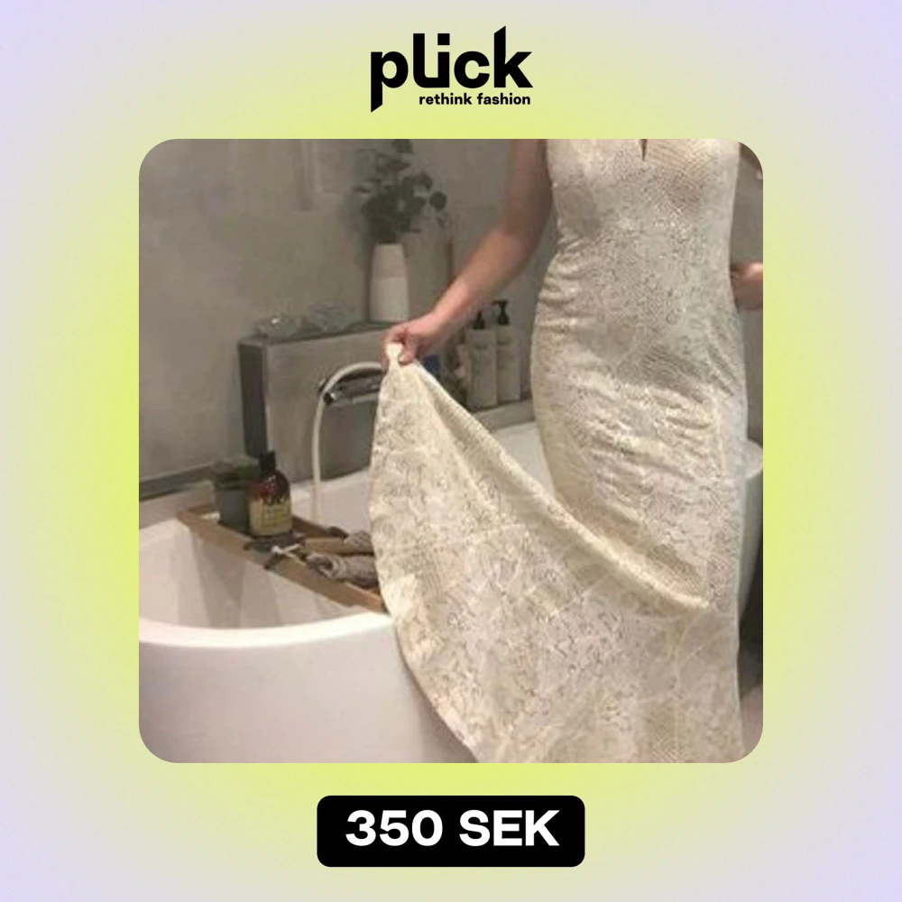 Säljer en superfin vit/beige långklänning i spets. Den har en v-ringad design och är perfekt för festliga tillfällen. Klänningen är ärmlös och har en elegant passform som framhäver figuren. Perfekt för sommarens alla fester!