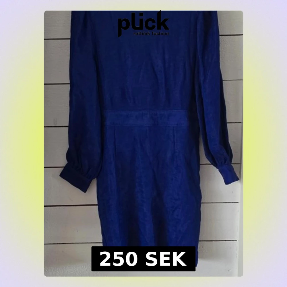 En kornblå kortklänning med långa ärmar och markerad midja. Klänningen har en djup v-ringning i ryggen och stängs med dragkedja. Materialet ser ut att vara mjukt och har en lätt struktur, perfekt för dig som vill sticka ut.