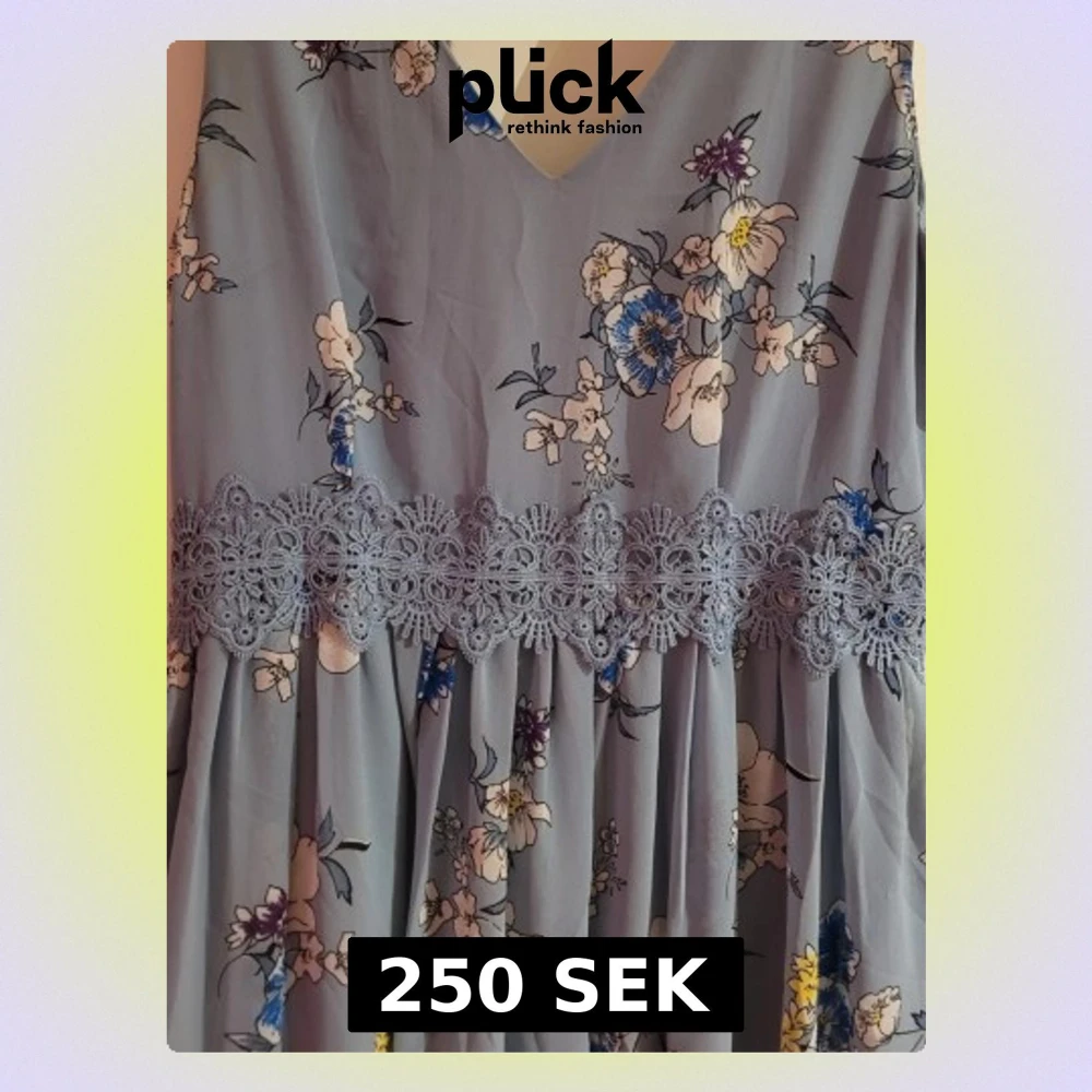 Långklänning i ljusblått med blommigt mönster i vitt, blått och gult. Klänningen har v-ringning, spetsdetalj i midjan och är ärmlös. Perfekt för sommarens alla tillfällen.
