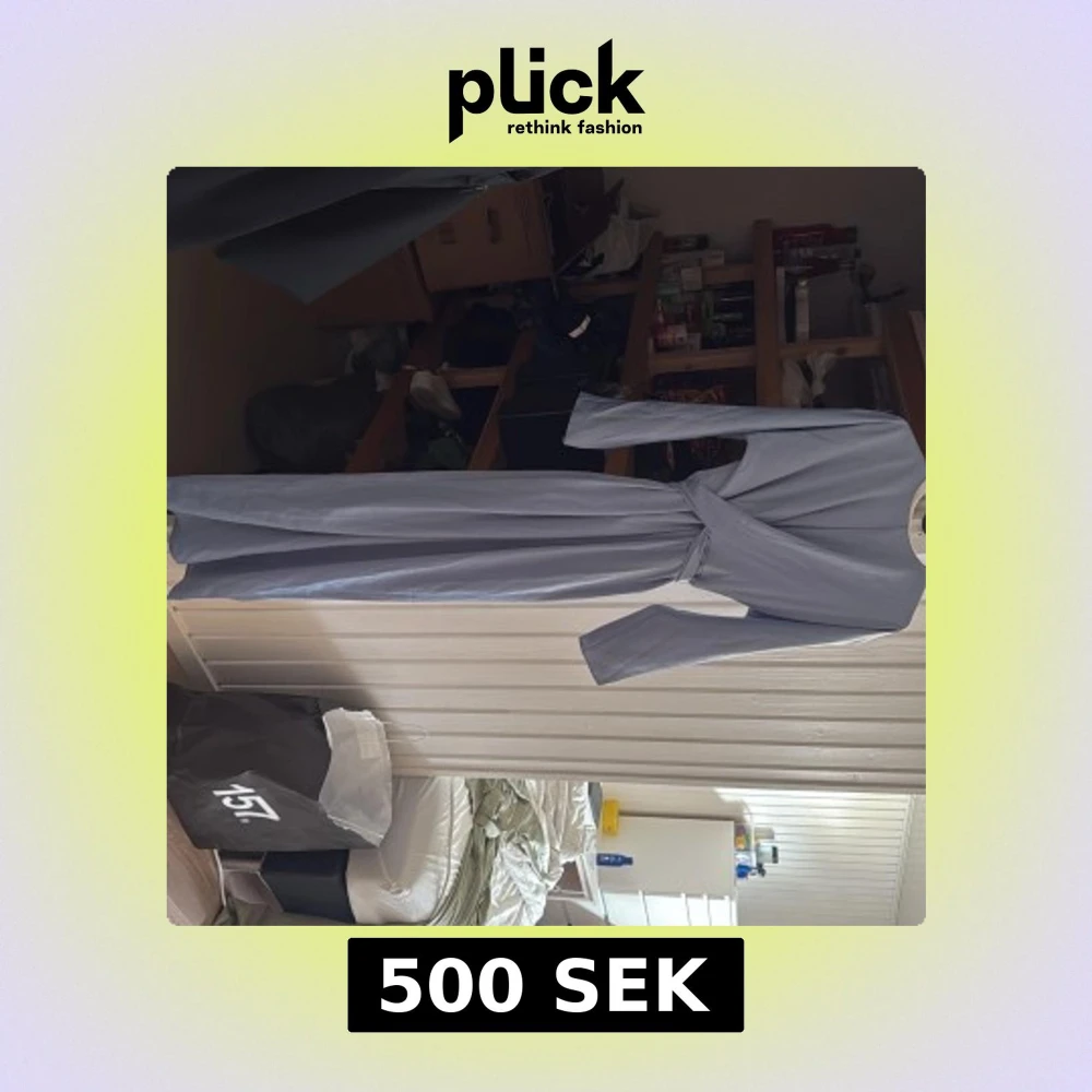 Säljer en elegant ljusblå långklänning med långa ärmar och knytband i midjan. Klänningen har en omlott-look upptill och är perfekt för dig som vill ha en stilren och enkel look.
