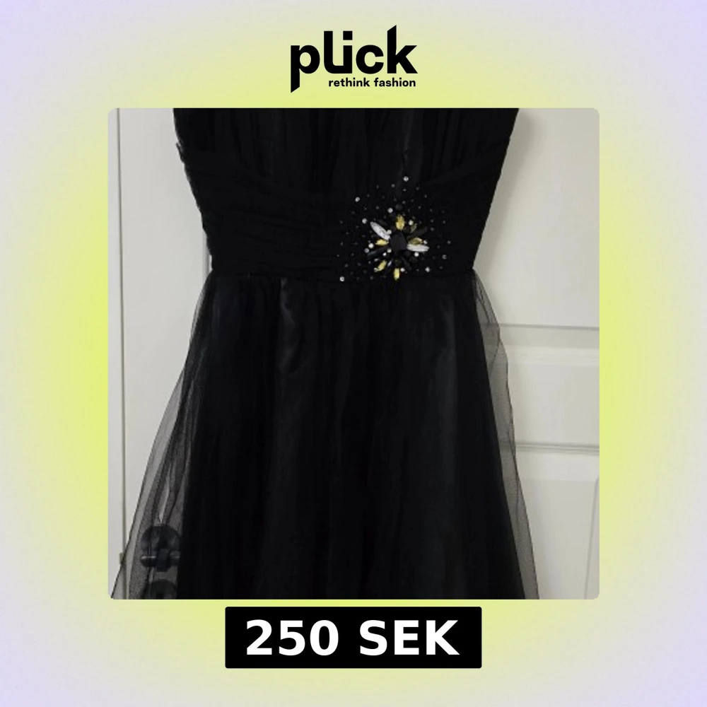 Snygg svart långklänning med transparent tyll över kjolen och en dekorerad pärldetalj i midjan med svarta, vita och gula stenar. Klänningen har axelbandslös design och ett veckat liv som ger en elegant siluett. Perfekt för bal eller fest!