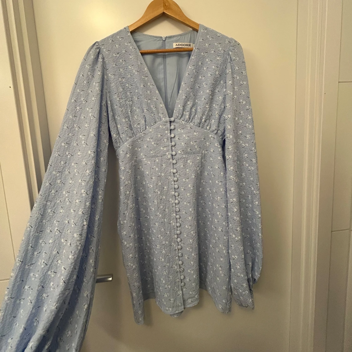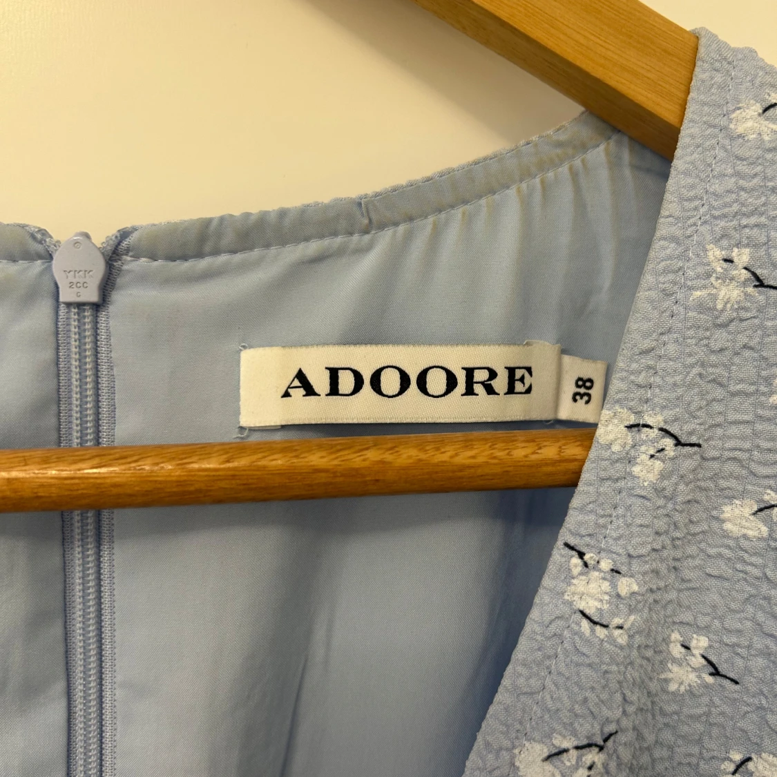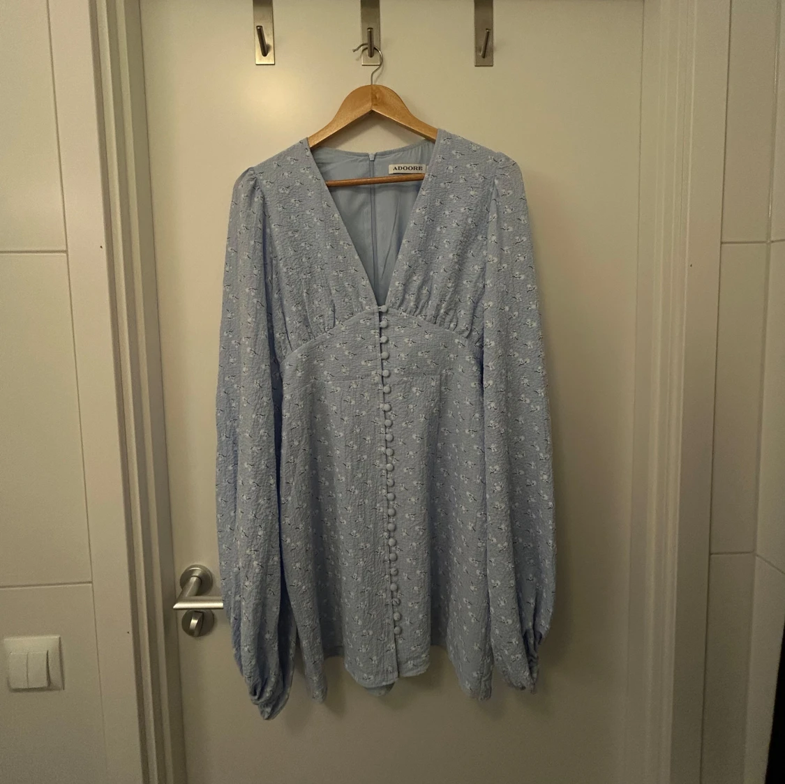 Adoore sommarklänning ljusblå med vita blommor i storlek 38. Använd en gång. Nypris 1495kr. Jättefin kort och figurnära sommarklänning. Älskar denna klänning men då jag inte använt den mer än en gång så är det nu dags att sälja. 🥲💕