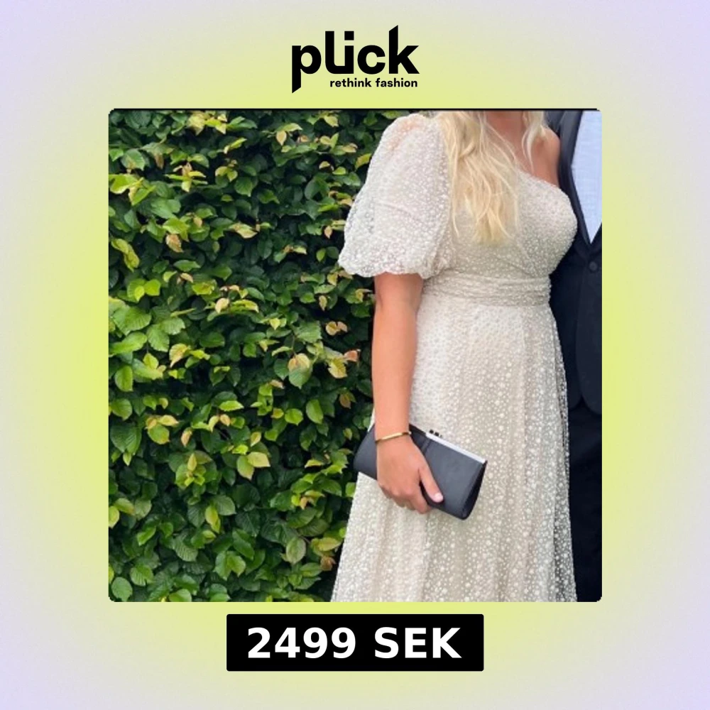 Säljer nu denna fina balklänningen. Superfin vit/beige balklänning med ett blommigt mönster och puffiga korta ärmar. Använd 1 gång. Nypris 5800. Ett hål finns nedtill, finns bild.