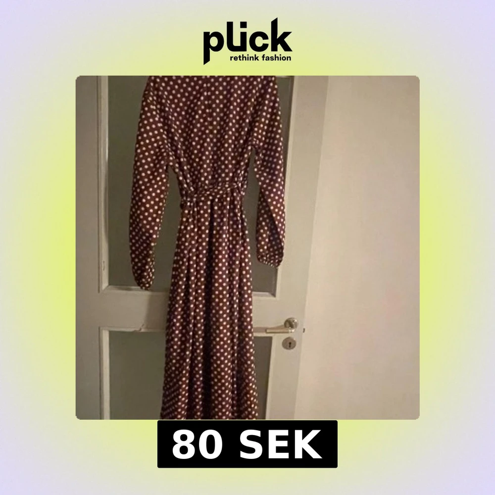 Lång brun klänning med vita prickar och matchande bälte i midjan. Klänningen har långa ärmar med resår vid handlederna och en avslappnad passform. Perfekt för dig som gillar retrovibbar och mönster som sticker ut.